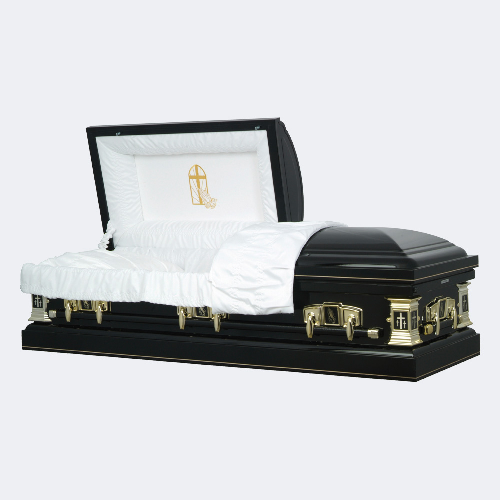 18-Gauge Sealed Metal Casket in Black /Gold Pinstripe with White Frost Interior with Praying Hands & Window Head Panel.
