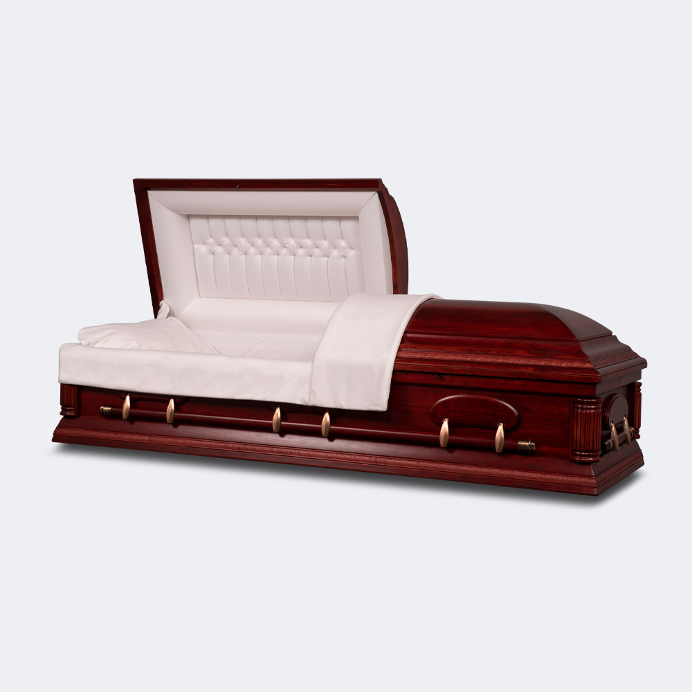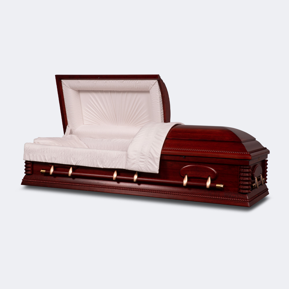 You want a casket for the dearly departed that fits their standards for quality and appearance. Our Cherry Caskets are an excellent option because of the quality hardware and handles, paired with exquisite wood shell construction. Cherry wood is naturally warm and timelessly beautiful, and this material’s durability and longevity can stand the test of cradling the departed for ages in their grave . We offer these types of caskets with velvet interior.
