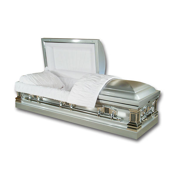 The Franklin Stainless Steel Metal Casket is a standout showpiece. The polished and ornate metal hardware on the sides and corners holds complementary handles and pairs beautifully with the shell’s muted silver color with brushed top. Even though the casket appears monochromatic, it has astounding style and bold visual appeal. On the inside is soft, white velvet interior shrouding the cushioning and pillow, giving your dearly departing friend or family member a peaceful resting place. The casket lid interior lives up to the casket’s overall aesthetic value with an attractively upholstered surface.