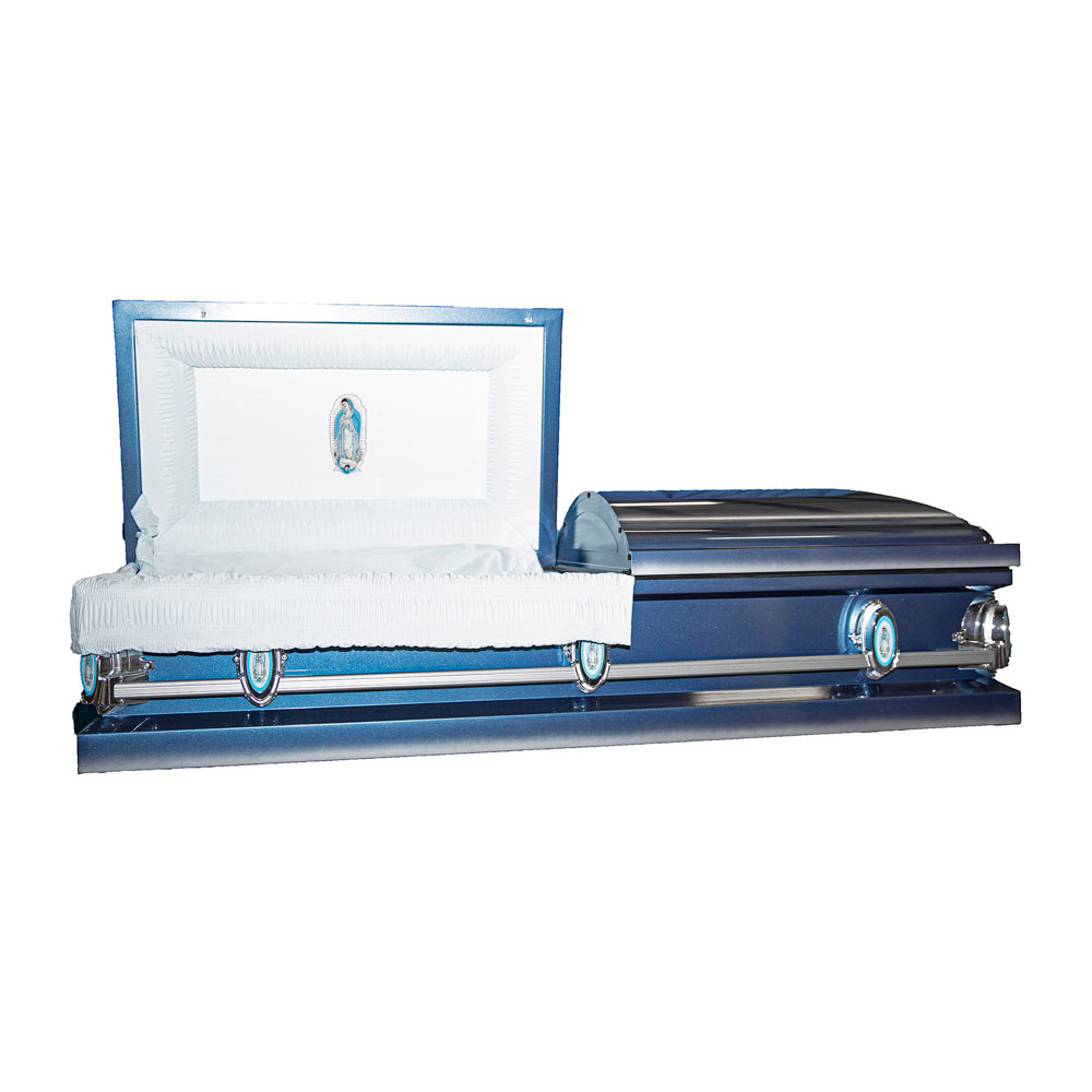 20-Gauge Sealed Metal Casket in Neo Blue/Silver Highlights with Blue Shirramatic Interior and Lady of Guadalupe Head Panel