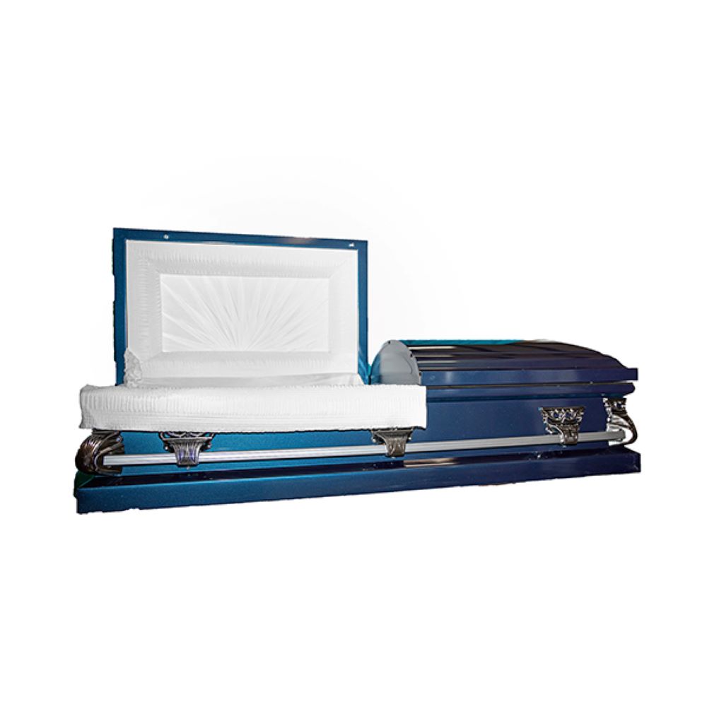 20-Gauge Sealed Metal Casket in Neo Blue with White Shirr Interior and Full Ray Head Panel