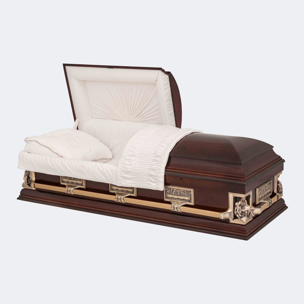 Poplar Wood Casket with Cherry Satin Finish with Champagne Velvet Interior.