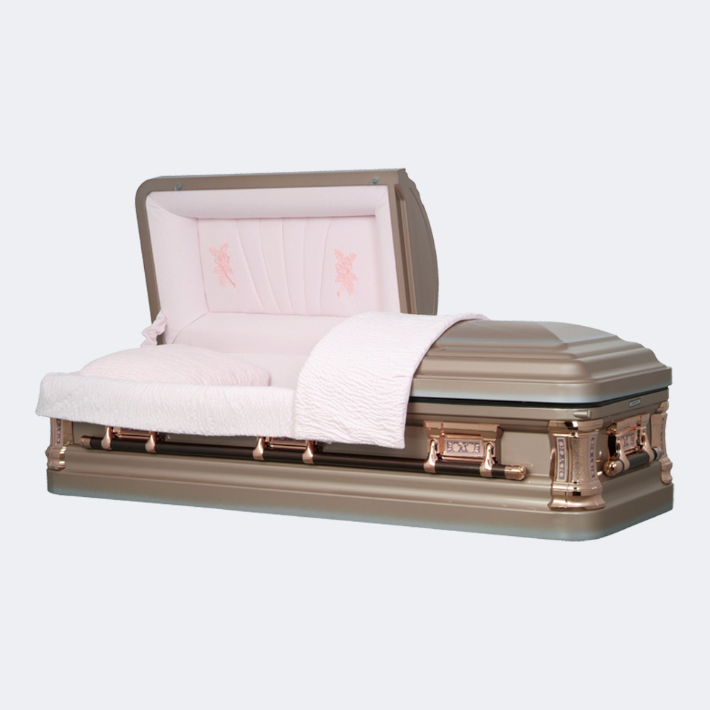 18-Gauge Sealed Metal Casket in Natural/Coral with Brushed Top and Sides with Pink Velvet Interior and Rose Head Panel